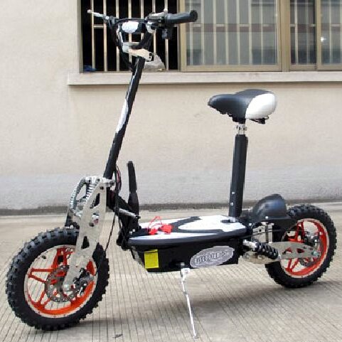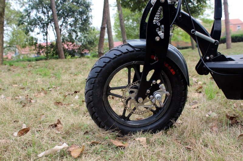 Самокат с мотором достигает скорости 35 км/ч при использовании батареи 36 вольт, и при этом имеет мощность 800 Ватт. Если использовать для него батареи 48 вольт, то он способен развить скорость до 45 км в час. Дистанция пробега на одной зарядке может достигать 20 км. Благодаря высокому клиренсу размером 16 см на нем без проблем можно преодолевать такие препятствия, как ступеньки или тротуарные бордюры. Он оснащен передним фонарем, задним стоп-сигналом и спидометром. Удобное и комфортное седло представлено съемным вариантом. Габариты самоката в разложенном виде 153х27х113 см и позволяют кататься на нем взрослому человеку ростом до 198 см. отсутствие пластика на электромобиле позволит избежать огорчения по поводу поломки. Быструю остановку обеспечивают передние и задние дисковые тормоза.